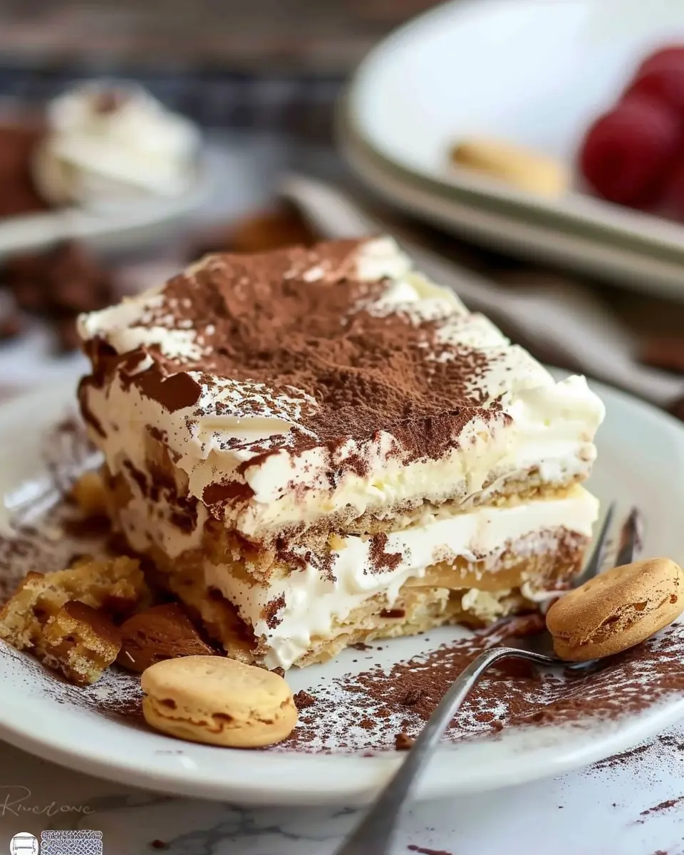 Garnitures : Complétez votre gâteau tiramisu sans cuisson avec une touche de cacao en poudre ou des copeaux de chocolat noir. Vous pouvez également envisager des baies fraîches, comme des framboises ou des fraises, pour une note de fraîcheur.