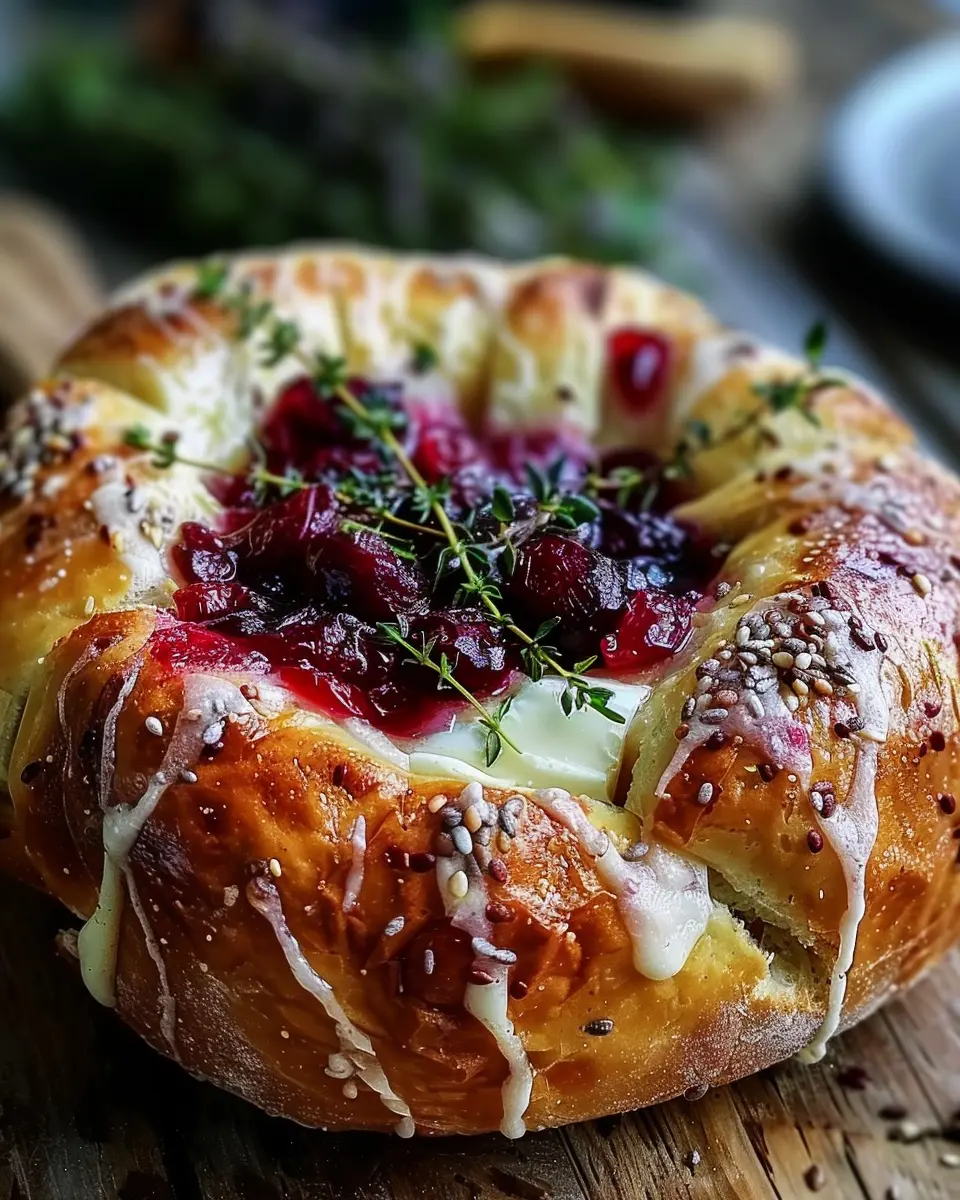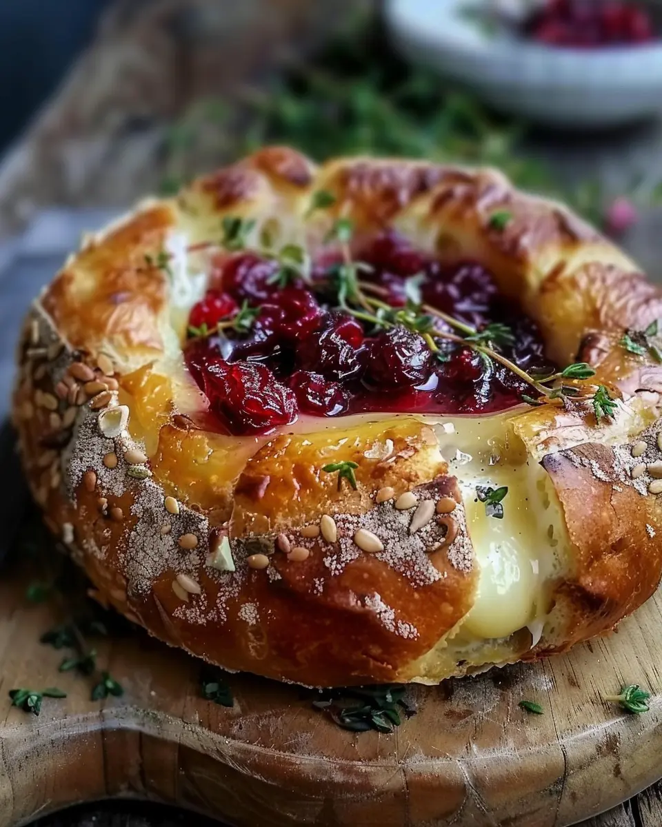 Découvrez comment préparer un délicieux brie cuit dans un pain, accompagné d’une sauce aux canneberges et au thym.