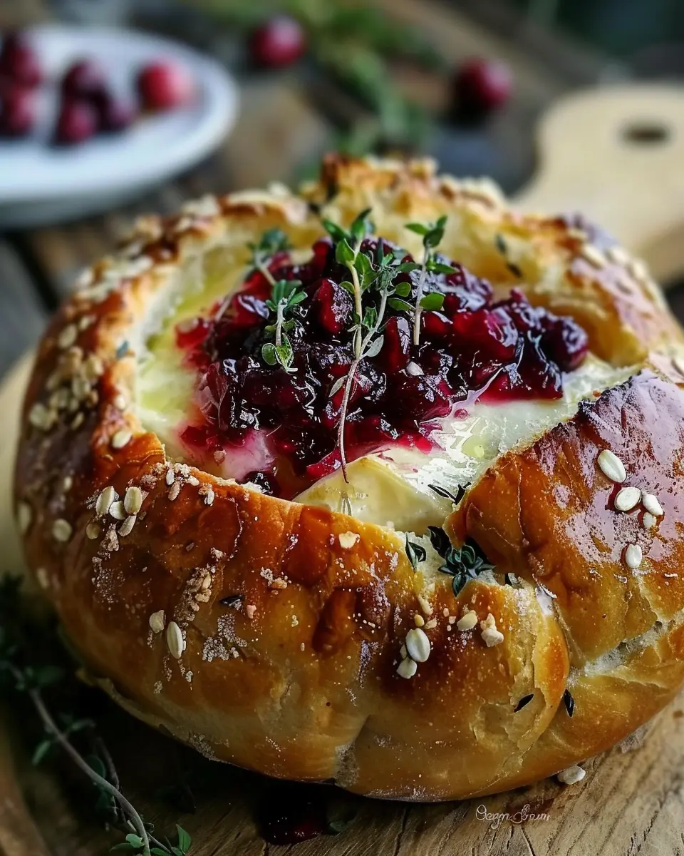 Brie baked in a bread bowl : sauce aux canneberges et thym indulgente