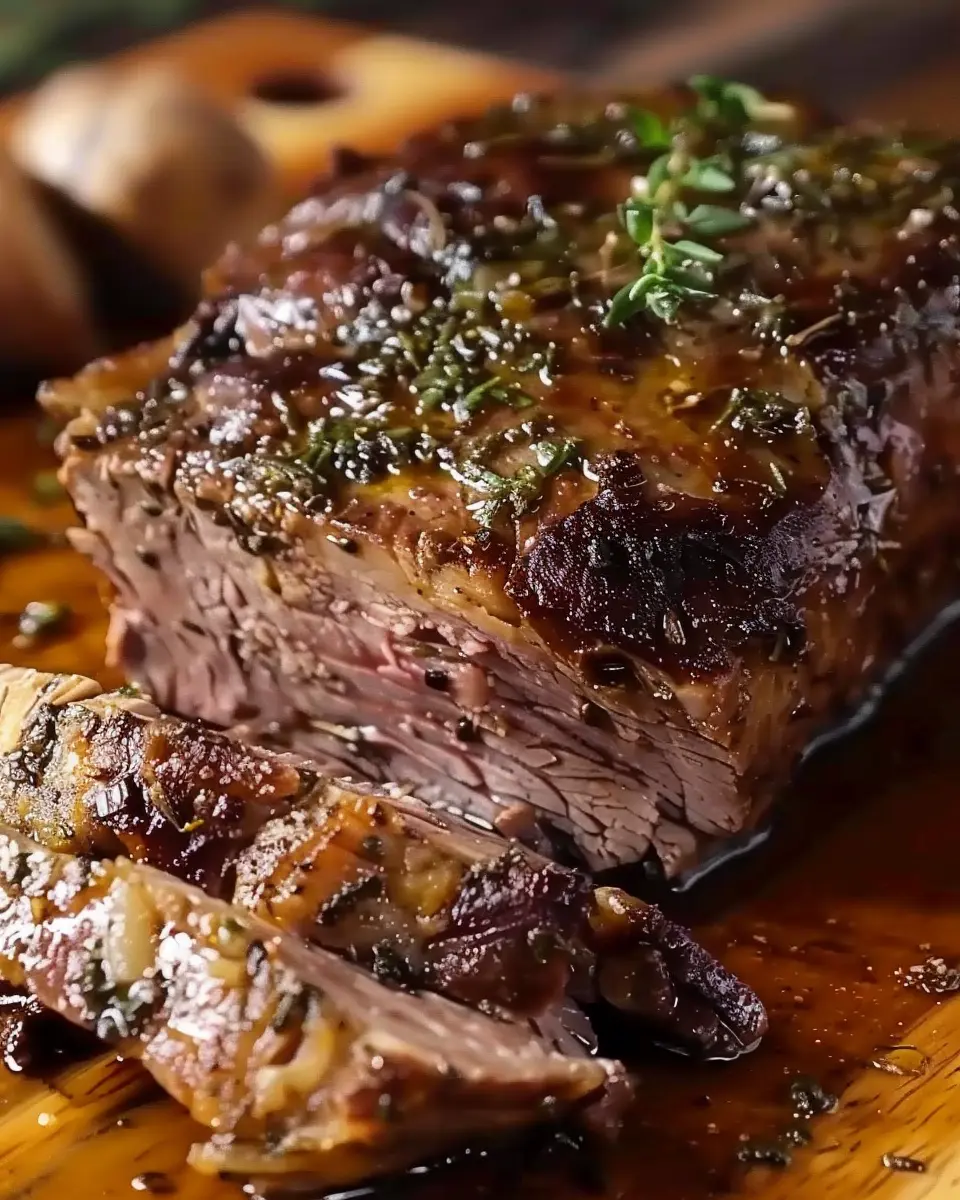 Un rôti de bœuf tendre et juteux préparé à l’ail et au beurre, parfait pour les repas familiaux.