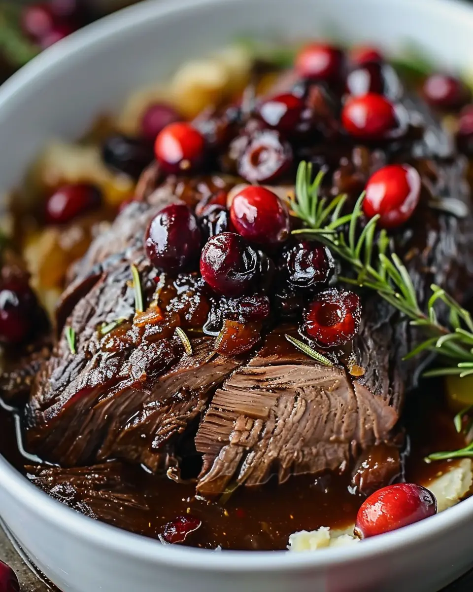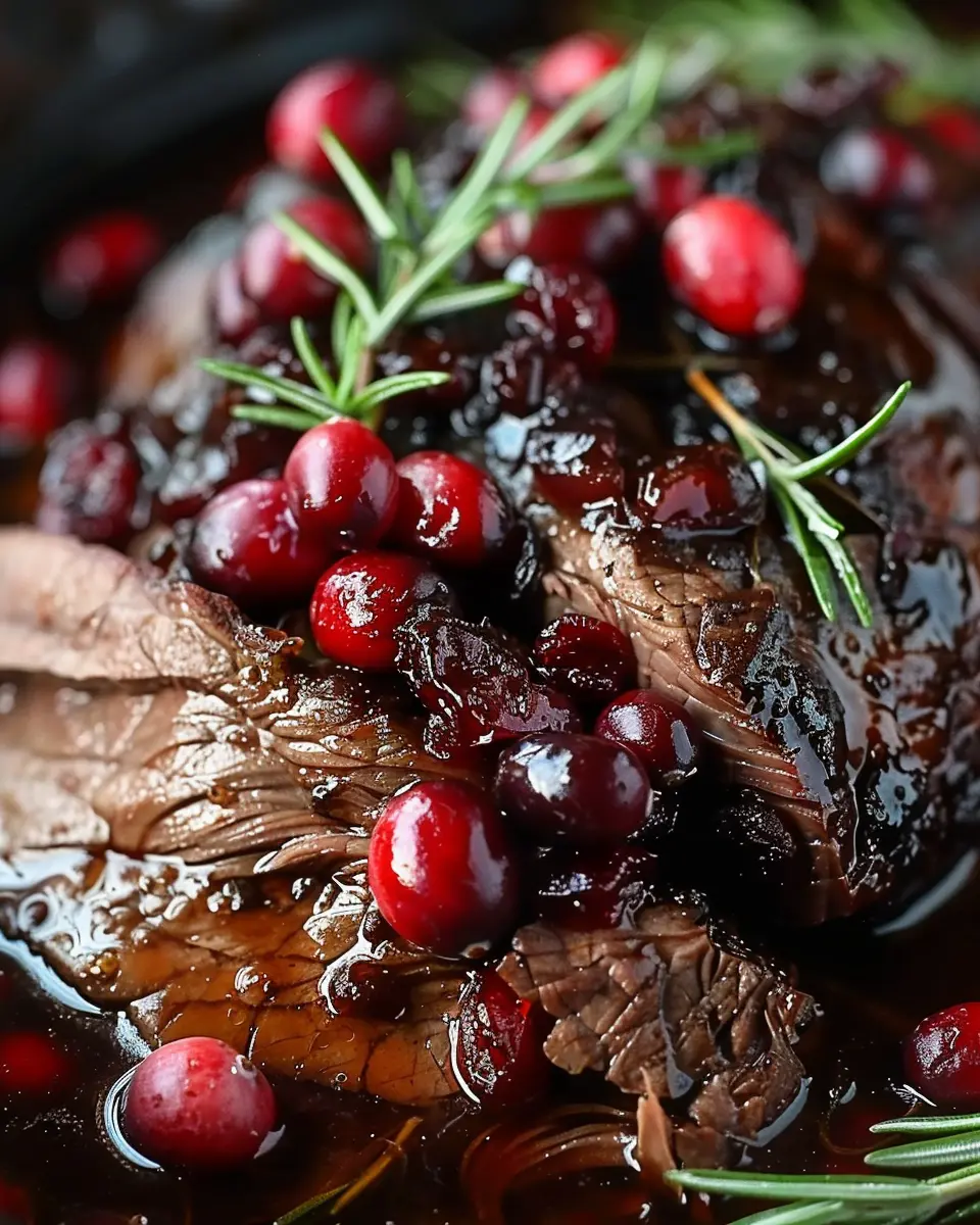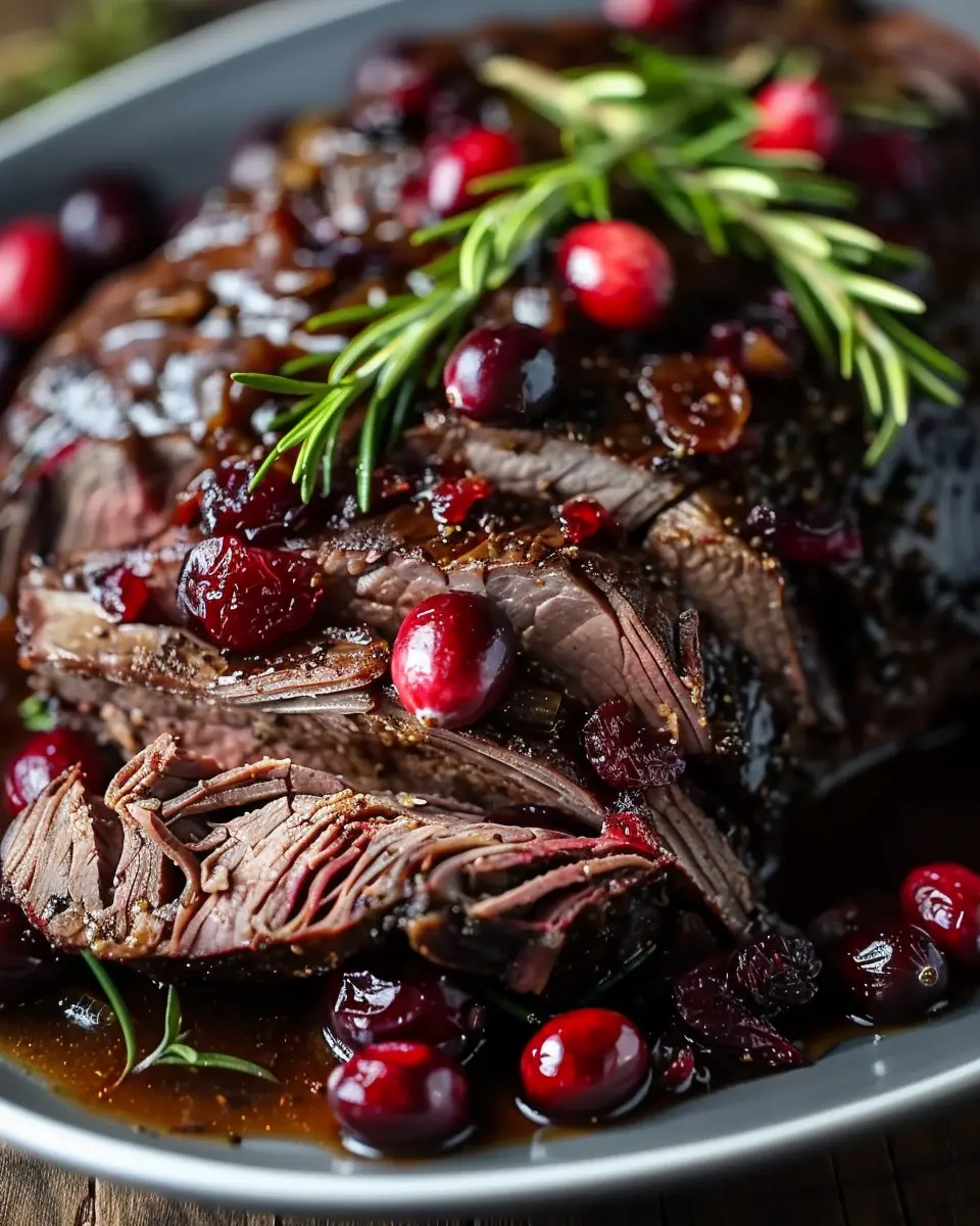 Un délicieux rôti de bœuf mariné dans une sauce balsamique avec des canneberges, préparé facilement dans une mijoteuse.