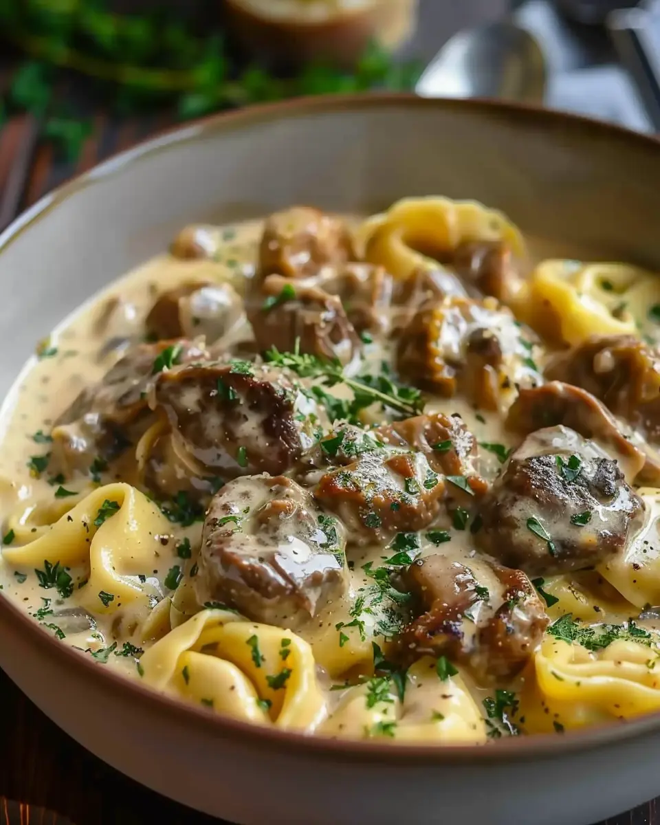Tortellini au bœuf Stroganoff crémeux en une seule poêle, facile et savoureux